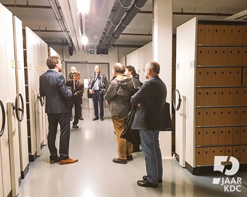 KDC-archivaris Ramses Peters geeft een rondleiding door het depot aan de internationale gasten.