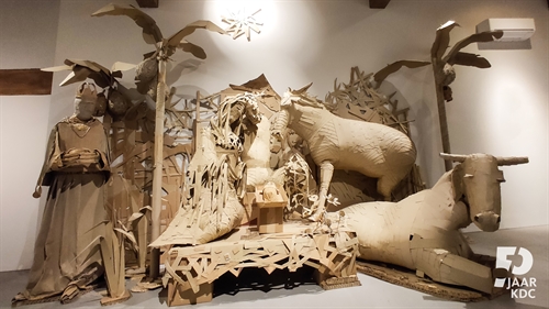 Levensgrote uitvoering van een kerststal in karton (Museum Krona).