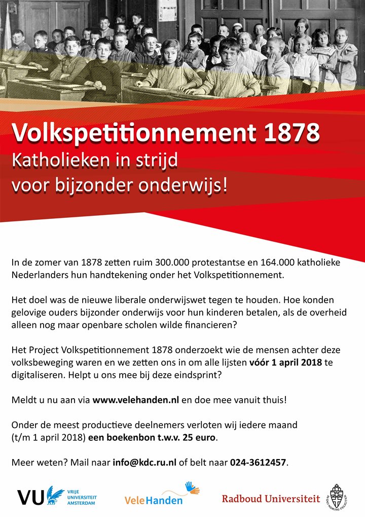 Bent u benieuwd of uw geboortedorp in 1878 ook in actie kwam om de bijzondere school te steunen en of uw voorouders daarvoor tekenden? Wilt u meewerken aan het onderzoek naar de ontwikkeling van de democratie in Nederland? Doe dan mee met de VeleHanden-actie om de handtekeningen van het Volkspetitionnement 1878 te ontcijferen en in te voeren via www.velehanden.nl.