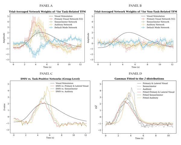 Fig. 10. Trial-averaging results: Panel A shows single-subject trial-averaged entries of the time-varying mixing matrix for the task-positive mode (TFM3) for the selected dataset. For comparison, panel B shows the trial-averaged entries of the time-varying mixing matrix for a TFM unrelated to the task for the selected dataset. Error bars represent the standard error of the mean. Differences between the DMN and: i) the average of the primary and lateral visual network; ii) the sensorimotor network, and iii) the auditory network across trials, task-runs and participants are indicated by the red, green and yellow Z-distributions in panel C, respectively. As a first parametrisation, these Z-distributions were fitted with independent gamma distributions shown in red for i), in green for ii), and in yellow for iii) in panel D.